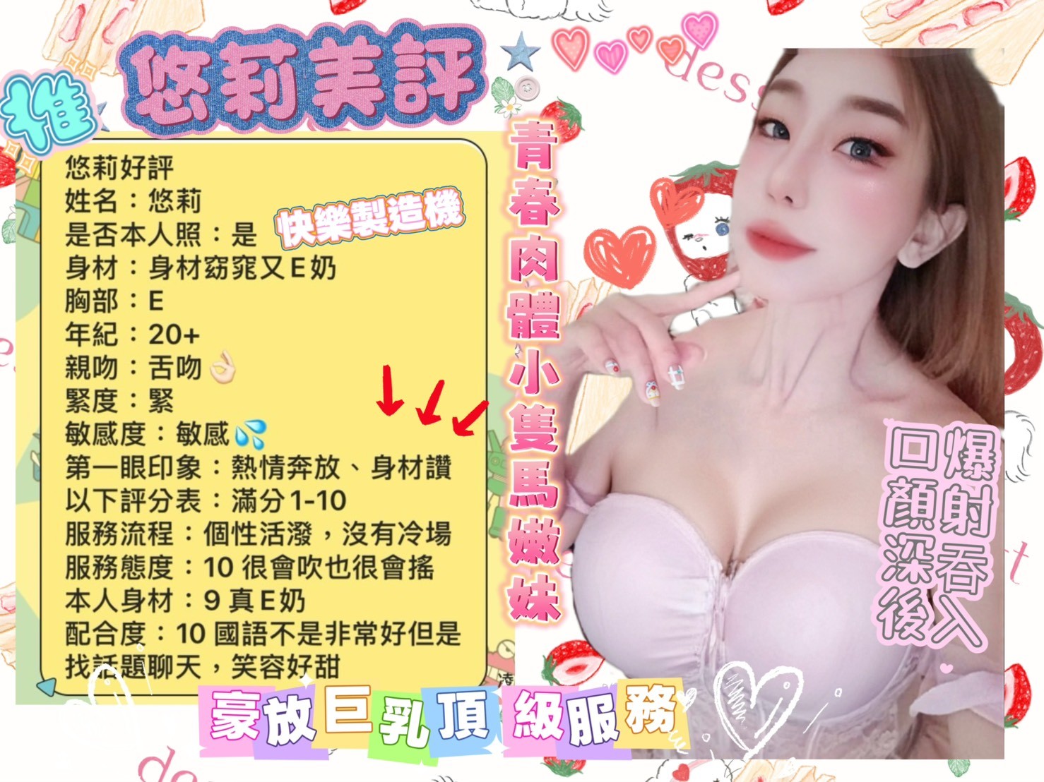 無套吹/小親親/舌吻/69/品鮑/舔蛋/奶炮/胸推/屁推/共浴/按摩/水中蕭/深喉嚨/絲襪(客自備)/角色扮演(客自備)
